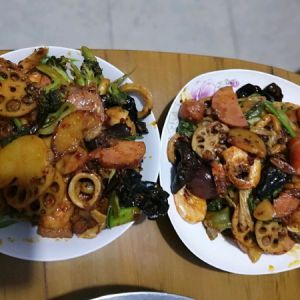 我忘记拍照了,虾,培根肉,五花肉都在油锅里过油。捞出备用。