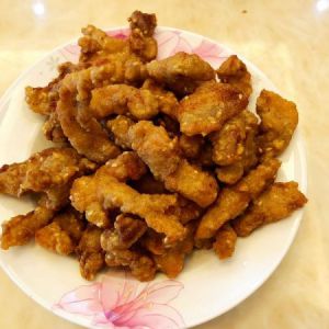 微黄时捞出,炸下一批,待下一批微黄时也捞出来,倒入前面一批复炸。