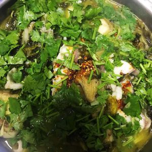 翻炒片刻加入煎好的鱼骨鱼头片后加水