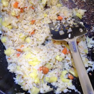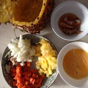 油热后,先放虾仁,变色断生捞出;放鸡蛋搅碎捞出;放胡萝卜丁、洋葱丁、青豆丁炒香,倒入蚝油适量,然后倒入米饭,不停翻炒,加鱼露、黑胡椒,最后倒入炒半熟的鸡蛋碎、菠萝丁,炒匀出锅。