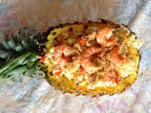 乘入菠萝容器中,摆好虾,撒上肉松,吃的时候拌入适量泰式辣椒汁,美味啊!