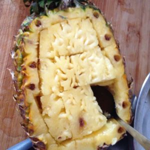 收拾菠萝,去掉1/4,留3/4,用刀顺菠萝壁划到底,再中间划出格子,然后用勺子挖出果肉,取出一到两块切丁备用。