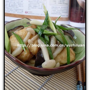 锅中留底油,放入香菇和白玉菇煸炒,炒制食材变软的时候加入炸好的豆腐片,放适量水大火煮开后改成小火加盖焖上三到五分钟,调入盐,胡椒粉,鸡精翻炒均匀,最后加入水淀粉勾一个薄欠,出锅前加入黄瓜片撒入青蒜苗即可。