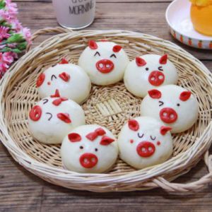 擀成一张比饺子皮稍微厚一点的薄片,用圆形模具压出圆面片,用筷子戳两个猪猪鼻孔做小猪鼻子