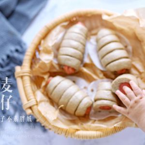 .面团顶端摆上1根香肠, 连同香肠由上往下卷起来。
