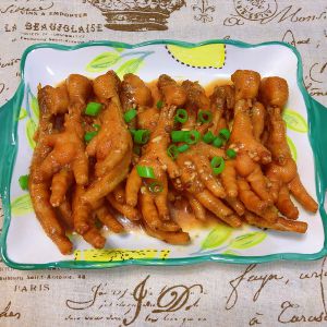 放入热水(我比较懒放的冷水,最好是热水,)末过鸡爪再多放一些水,放盐,放腐乳汁。中火煮至沸腾,再小火烧,在最后打开锅盖大火收汁,然后放入少量蚝油,鸡精。煸炒均匀。