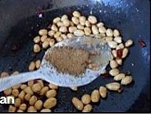 放辣椒粉,盐 白糖,花椒粉翻炒均匀,然后将花生米出锅晾凉(之所以先关火然后再放调味料,是因为如果开火放调料的话,其他的调料不会有太大的影响,但是白糖预热就会融化了,而且开火炒的话,花生米的火候也不容易掌握,所以,个人意见还是先关火,然后放调料)。