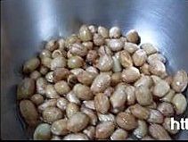 锅内放油,放入冷冻好的花生米,用小火,慢慢的将花生米炸成浅金黄色(这个过程不要着急,一定开小火,因为花生是冷冻的,放到锅里还会有噼啪的声音,在炸花生米的过程中,要用铲子轻轻的翻动,让花生米受热均匀)。