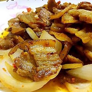 放入洋葱片与回锅肉一同翻炒,直到洋葱去生炒熟再根据个人口味适当添加食盐、凤球唛味精体味即可出锅盛盘