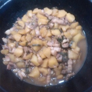 炒好肉后放土豆,加适量水,放盐酱油和糖,剩下的就等出锅喽,熟悉我的朋友都知道我不喜味精,今天还这样,不放味精鸡精什么的,直接原味。