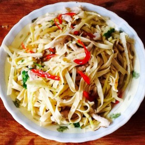 用锅里的余油将泡姜泡辣椒炒出红色,放入笋丝豆皮丝,加少许盐和糖,最后加入肉丝,翻炒,加少许香油起锅