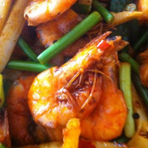 放入蒜苔翻炒均匀后在放入虾翻炒。