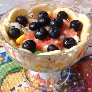 把香蕉片放入喜爱的容器中围边,中间放入苹果、生梨和玉米、豌豆粒,撒上西柚丝,最上层放上蓝莓最为点缀,淋上酸奶即可