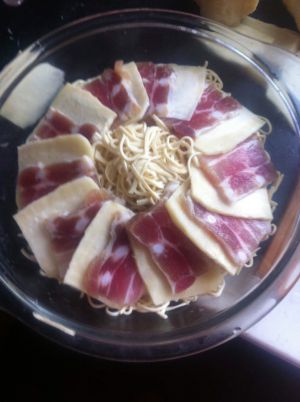 把咸肉和冬笋一个夹一个放在干丝上