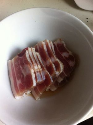 咸五花肉切薄片,用料酒腌制一会