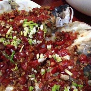 蒸锅放水开火,盘子中放姜片和葱段,把鱼头铺上面,铺上几片姜。水开后,放进去蒸3分钟,出锅倒掉血水。这时把剁椒均匀地铺在鱼头上面,再把金银蒜均匀地撒在上面,最后把炸过的油均匀地淋在上面,放进蒸锅中,加盖子,视鱼头大小蒸15-20分钟。