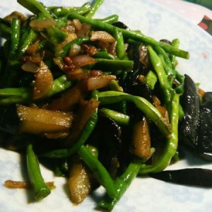 炸好后,茄子起锅,放入姜蒜,花椒粒,炒出香味后,放入豆角和茄子,加少许生抽,蔬之鲜,适量盐,菜熟起锅。