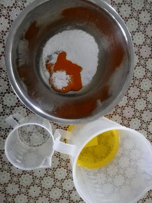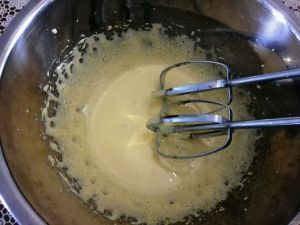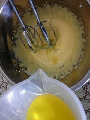 加入一点点油,快速搅打,直至蛋油混合状态。