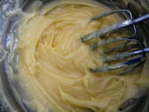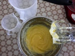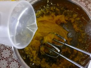 加入了三分之一的油后蛋黄糊变得越来越粘稠,此时加入一点白醋,继续搅打。