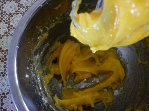 将蛋黄搅打至颜色变浅,体积膨胀。这步一定要打到位。