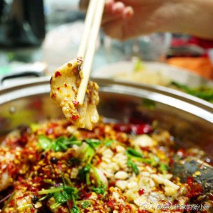 汤烧开以后,把炒过水的鱼片轻轻下如,开锅后将鱼片和汤汁一起倒入事先铺好菜第的深盆中。表面撒辣椒碎,蒜末。