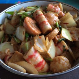 放入洋葱丁 青椒丁 翻炒 加入辣椒酱 蚝油 白糖 盐 味精 翻炒出锅