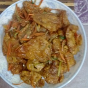 锅内留少许油,将葱丝,姜丝,胡萝卜丝,蒜片下锅翻炒,放炸好的肉片,加入调好的汁,快速翻炒,加香菜,汁收干出锅装盘,即可享用了!
