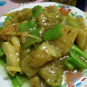 锅中放少许油葱、姜爆锅,倒入炸好的茄子、土豆、地瓜后放一点水。倒入调料汁翻炒均匀(不可多翻炒)。放入尖椒、蒜沫(尖椒和蒜沫必须最后放)翻炒,最后放入搅拌好的淀粉勾芡。就可以出锅了!