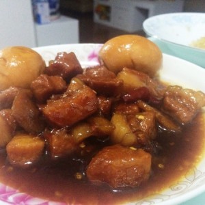 持续小火,放入五花肉翻炒,让冰糖液均匀包裹五花肉