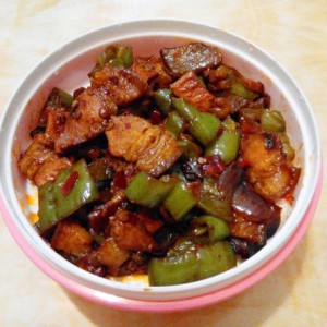 放入切好的青椒和洋葱,炒几下,加入一勺料酒,中火翻炒几分钟(如果菜偏干,可以加一两勺淀粉调匀的水),盖上盖子焖一会关火;