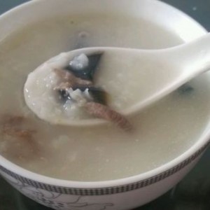 观察大米稀饭,熬到出米油比较粘稠的时候,先加入肉丝,然后放入皮蛋,煮几分钟。
