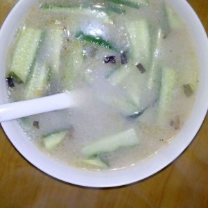 葱爆锅下皮蛋翻炒,加适量水烧开下黄瓜片,开锅点香油上桌。