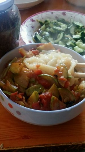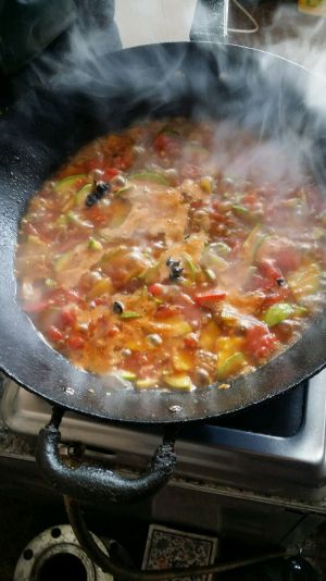 先炒西葫芦炒到变颜色!放西红柿!!加少量水!!煮一会!!
