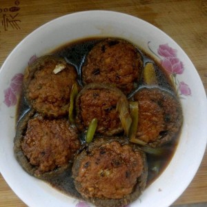 香菇去根,用开水焯一下,然后凉水浸泡洗净,肉馅加葱姜沫,料酒,耗油,然后用手拿起往碗里摔十分钟(太干可以加点蛋清)