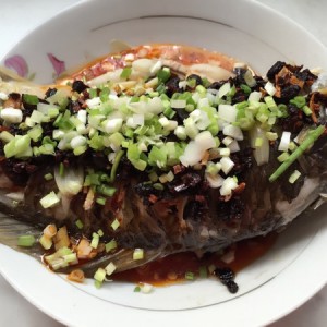 炒锅内加少量香油加热,放入姜蒜末,豆鼓,生抽,少量料酒煸炒,淋到蒸好的鱼身上,撒上葱末OK!