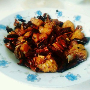 转大火,加入剪成段的干辣椒(辣椒籽也要)和花椒爆炒至味道呛鼻后,倒入刚才炸好的鸡块,加一小勺白糖翻炒均匀后出锅。因为腌制的时候已经加了足够的盐,所以这一步不需再放盐。