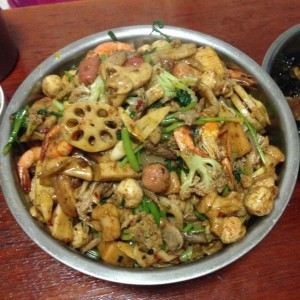 将五花肉,各种丸子下入锅中翻炒,其次放入蘑菇