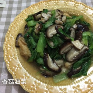锅内加油,加入香菇翻炒约一分钟。然后加入青菜、油面筋继续翻炒。然后加入蚝油、香油。