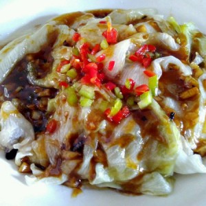 汤汁开锅后煮5-10秒左右。均匀地浇在码盘的生菜上。撒上青、红彩椒粒。完成。【本人尝了一下汤汁,很咸,不知道为什么浇到菜上后,吃起来却不咸,有一股淡淡地甜味。