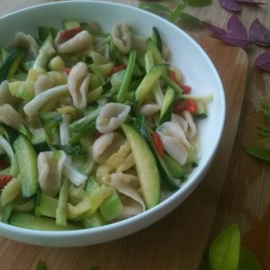 蒜末爆香,先南瓜,再入猫耳朵,点水略焖,入盐,葱白段,枸杞点缀炒匀起锅