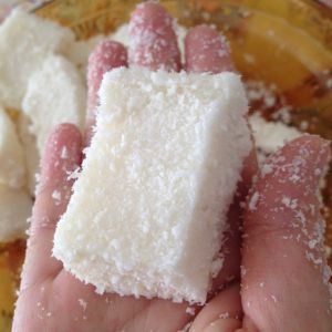 切好后轻轻取出在椰蓉里面滚一滚,就做好了!很简单吧