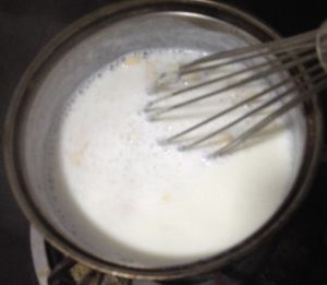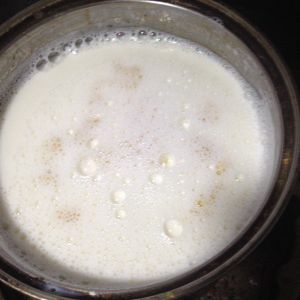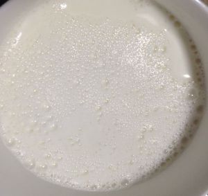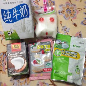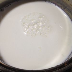 将纯牛奶和椰浆倒入小奶锅大火—小火模式煮沸后关火。这个煮的过程很快,大家站在奶锅旁边不要乱走,奶沸起马上关火。