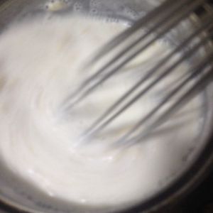 我用打蛋器搅拌了半天,吉利丁粉粘住了或是一下倒多了,建议大家用筷子搅拌慢慢倒进去。