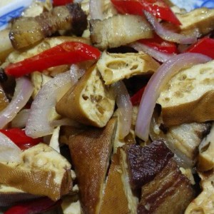 这才开始炒香干回锅肉.五花肉香干切片.洋葱红椒切丝