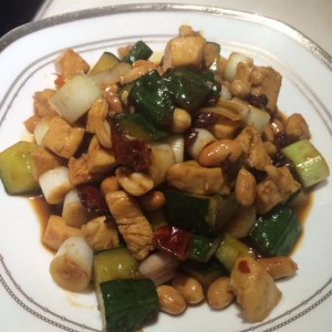 炒到鸡肉有烤肉的香味出来就把黄瓜和花生,还有捞出的麻椒和辣椒一起倒入,加入酱汁一起翻炒出锅