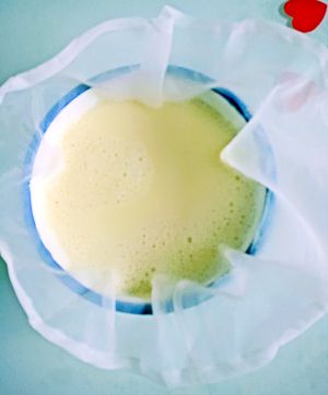 做好的豆浆用专用细沙布过滤一次即可(用滤网最好过滤两次效果更好)