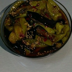 尖椒去把洗净,长茄子洗净切条,然后把尖椒和茄子都用热水煮到变蔫,大概煮8分钟,煮好后控干水分