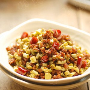 锅中倒入油,大火加热待油7成热时放入豇豆粒,改成中火煸炒3分钟左右,捞出备用