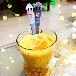 选个漂亮的杯子,把煮好的西米倒入杯中,然后是搅好的液体倒入,最后将芒果粒倒入即可。