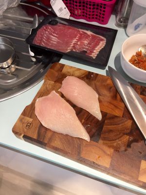 把两块鸡胸合起来,用培根包卷,可以用牙签固定,煎的时候培根不容易散落